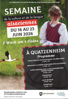 ⌠Du 17 juin au 23 juin 2026, une semaine dâanimation « E Wuch um s ElsĂ ss » autour de la langue et de la culture alsaciennes sera organisĂ©e par la commune en collaboration avec les associations.